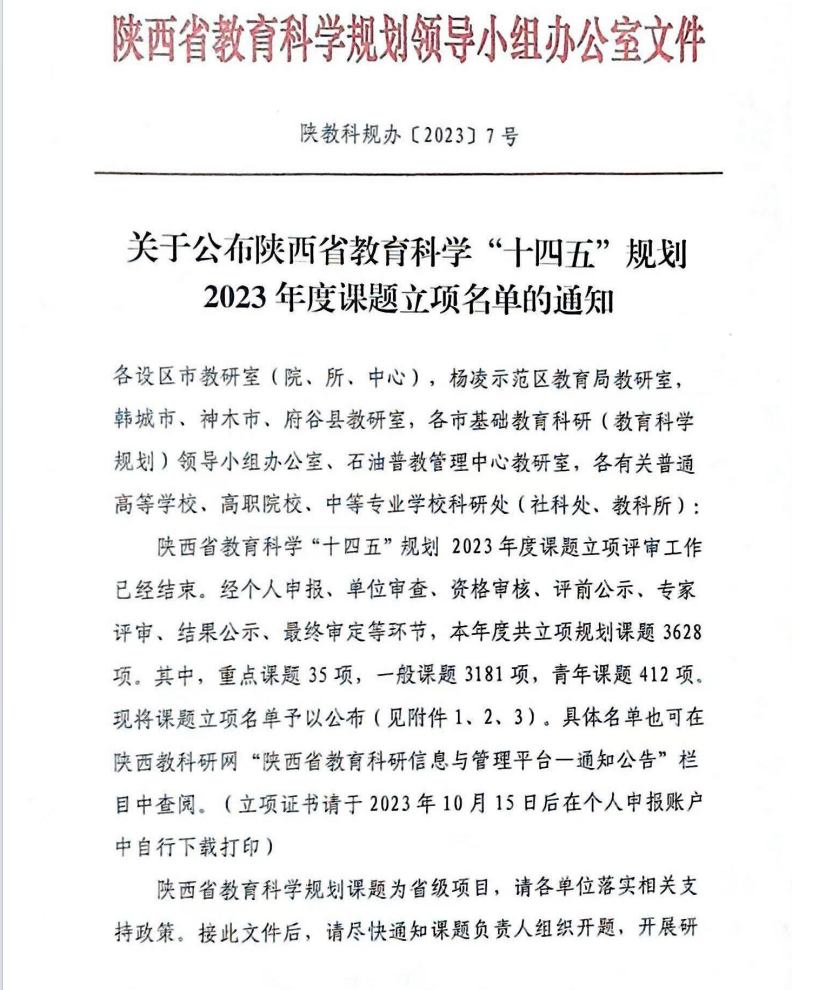 近日,陕西省教育厅发布了《关于印发2023年度科学研究计划项目的通知》(陕教函〔2023〕1170号)、《关于公布陕西省教育科学“十四五”规划2023年度课题立项名单的通知》(陕教科规办〔2023〕7号)。我校推荐申报的...