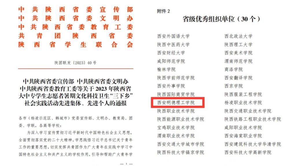 近日,中共陕西省委宣传部、中共陕西省委文明办、陕西省委教育工委、共青团陕西省委、陕西省学生联合会联合下发了《关于2023年陕西省大中专学生志愿者暑期文化科技卫生“三下乡”社会实践活动先进集体、先进个人的...