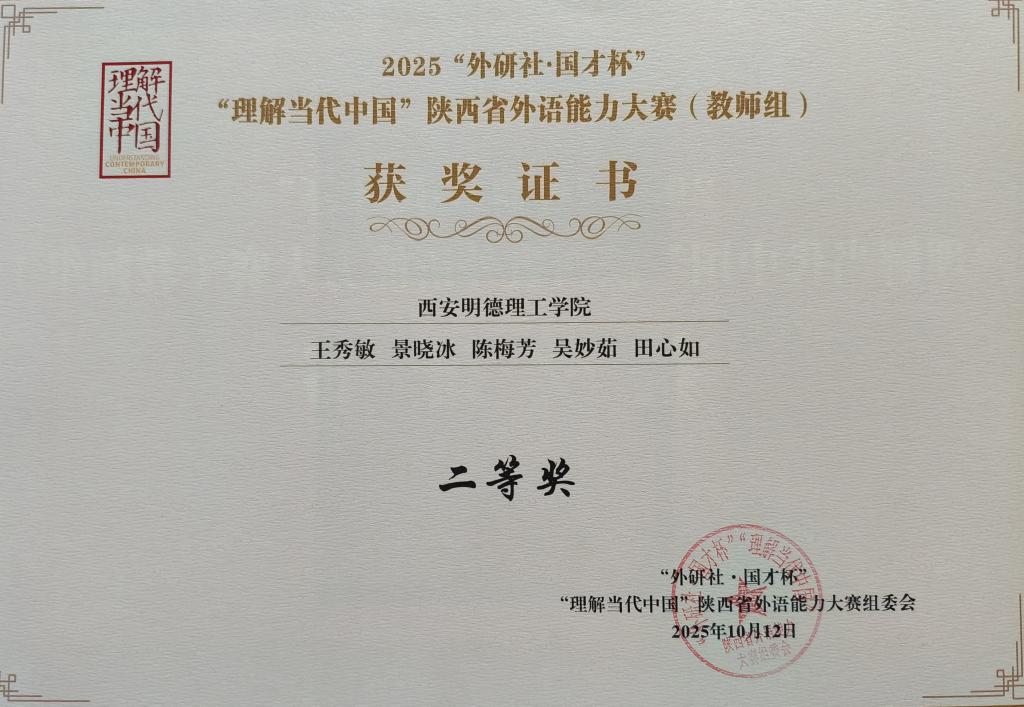 近日,2025“外研社·国才杯”“理解当代中国”陕西省外语能力大赛圆满落幕。西安明德理工学院语言文化传播学院教师团队(王秀敏、景晓冰、陈梅芳、吴妙如、田心如),团结协作、积极备赛,最终荣获省级二等奖,展现...