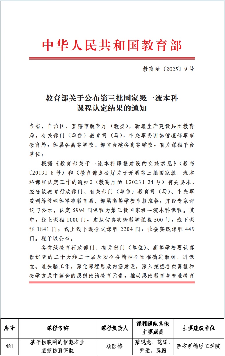 近日,教育部发布《关于公布第三批国家级一流本科课程认定结果的通知》(教高函〔2025〕9号),我校杨园格老师主持的《基于物联网的智慧农业虚拟仿真实验》课程成功入选第三批国家级一流本科课程(虚拟仿真实验教学...