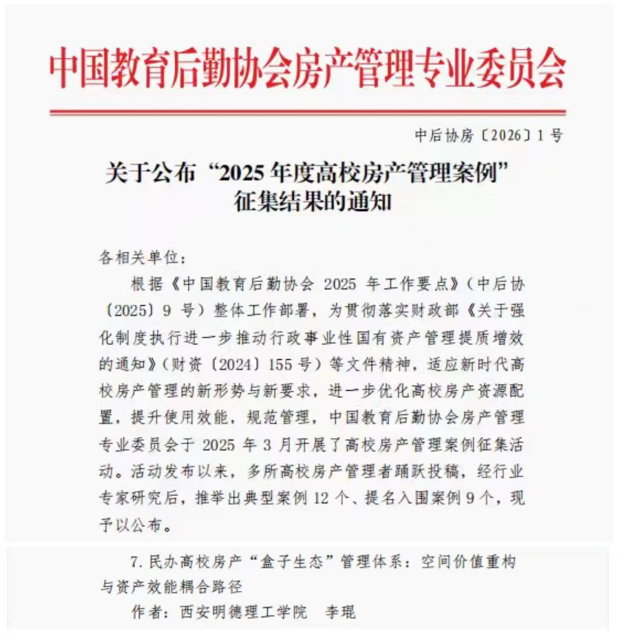 近日,中国教育后勤协会房产管理专业委员会公布2025年度高校房产管理案例评选结果,我校资产管理处申报的《民办高校房产“盒子生态”管理体系:空间价值重构与资产效能耦合路径》成功入选。这标志着我校在房产资源...