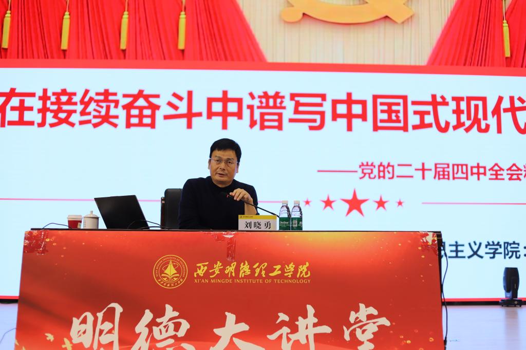 2025年11月17日,我校第81期“明德大讲堂”在四季廊桥报告厅隆重举行。本次讲座邀请到宝鸡文理学院马克思主义学院院长刘晓勇教授作题为“在接续奋斗中谱写中国式现代化新篇章——党的二十届四中全会精神专题辅...