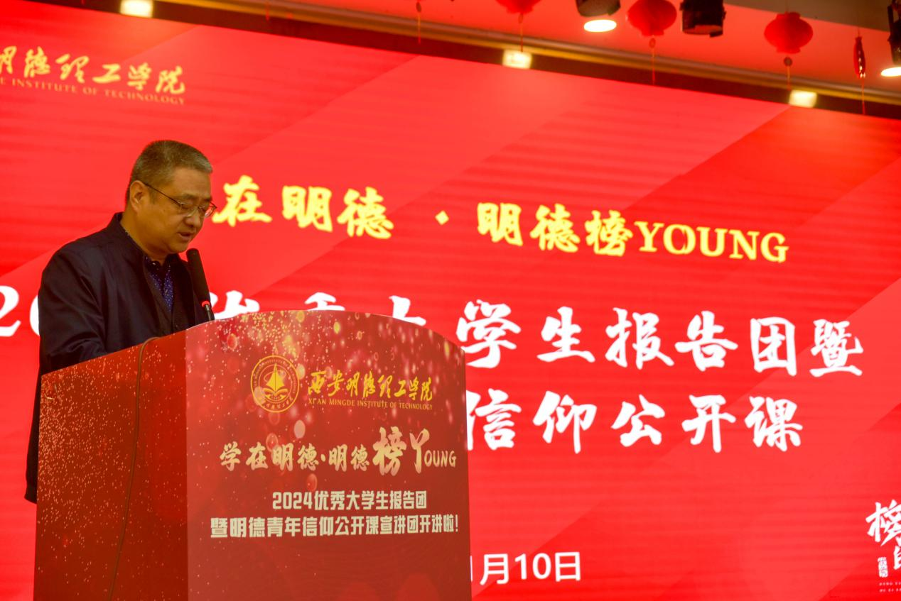 宣讲会上,辛浩宣读了《关于选聘周颖、俞国栋等11位同学为西安明德理工学院2024优秀大学生报告团暨明德青年信仰公开课宣讲员的决定》,宣讲员由2023-2024学年国家奖学金获得者、学生干部、优秀退役学生组成。刘雄、曾凯、刘诗宇老师为宣讲团成员颁发聘书及奖杯。