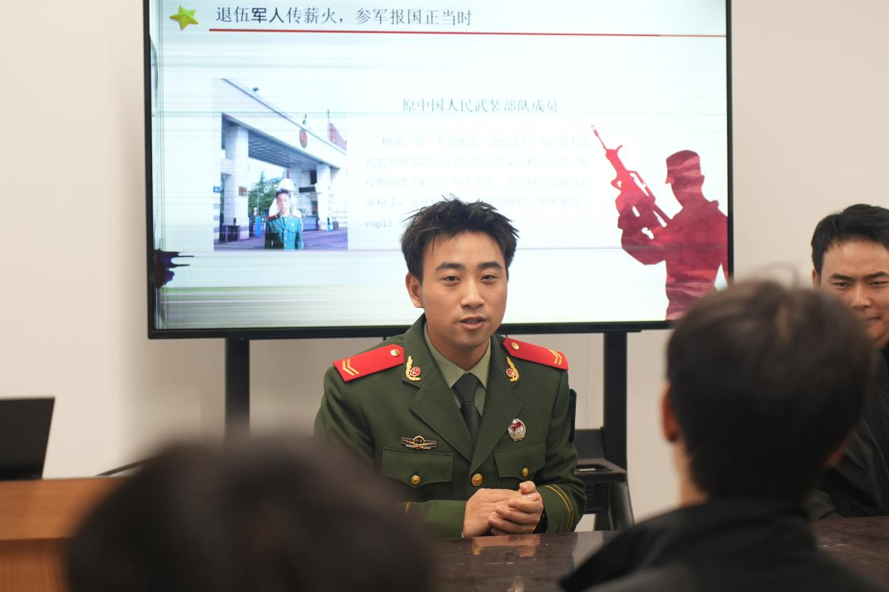 此次活动特别邀请了学院江文希、杨康两位退伍学生与现场同学进行交流分享。他们结合自身经历,分享了在军营中的点滴故事,从艰苦卓绝的训练到执行重大任务的荣耀瞬间,从青春热血的初心到为国奉献的使命感,他们的讲述引发了现场阵阵掌声。
