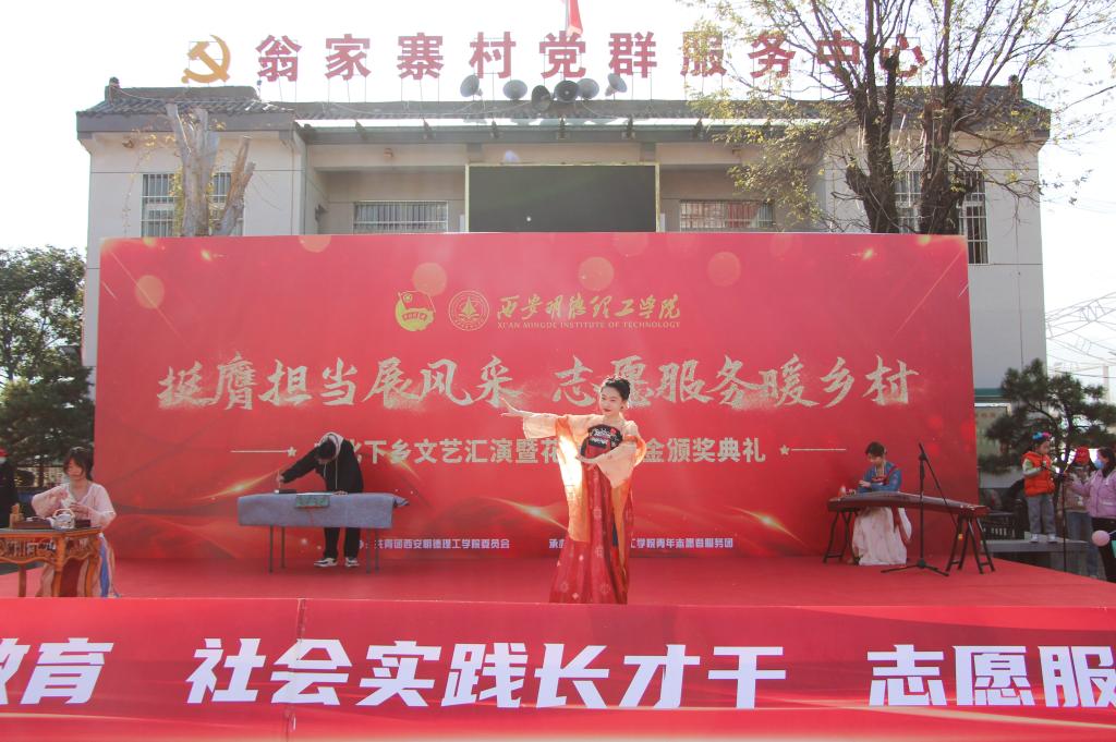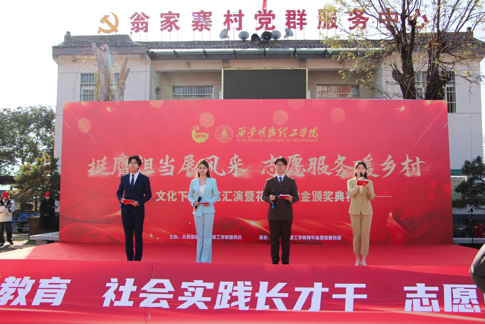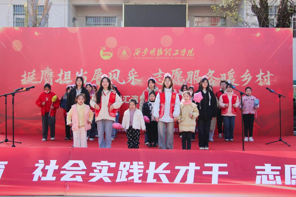 2024年11月30日,“沣河行动”义务家教项目社会实践基地——翁家寨村,洋溢着浓厚的温情与欢乐。西安明德理工学院青年志愿者服务团200余名学生志愿者齐聚在村委会广场,隆重举行“挺膺担当展风采· 志愿服务暖乡村”第十六届文化下乡文艺汇演暨“花蕾”奖学金颁奖典礼。村党支部书记兼村委会主任徐立、村监督委员会主任翁建立、学校党委学生工作部副部长童杨梓、校团委副书记刘雄、党委学生工作部蒋昱辰、王睿,语言文化传播学院团委书记周清岚、智能制造业控制技术学院辅导员王培茹、翁家寨、西留堡的父老乡亲、受教儿童,学校各校级团学组织负责人以及青年志愿者等400余人参与了活动。