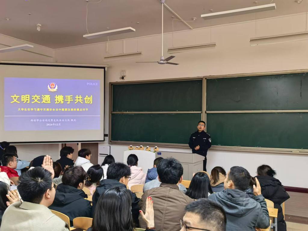 为切实提高我校师生交通安全意识,教育引导大家养成文明驾车、平安出行的良好习惯,12月25日,学校组织开展交通安全知识宣传讲座,邀请西安市公安局交警支队长安大队安监中队民警甄龙以“文明交通、携手共创”为题,为全体辅导员以及学生代表进行交通安全宣传专题培训。本次培训由智慧安全警务处处长宋敏纲主持。