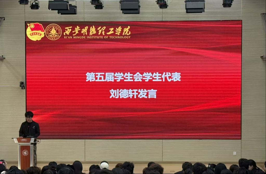 大会在激昂的共青团团歌和校歌声中拉开序幕,郭庆宣读了《共青团西安明德理工学院明德科技职业学院委员会关于2025-2026学年院级学生干部任命的决定》。他感谢学院第四届团委团学干部们的付出与奉献,同时他希望新一届团学干部能够牢记使命,认真履行职责,共同书写学院的美好未来!