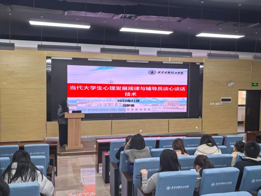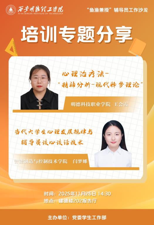 11月26日,学校在建德楼202报告厅以“聚焦心理育人能力提升”为主题举办“鱼渔兼授”辅导员工作沙龙,邀请明德科技职业学院辅导员王会霞和智能制造与控制技术学院辅导员闫梦娜作专题分享。此次活动通过经验交流,共同探讨我校心理育人能力提升。全校辅导员共同参与了此次活动。