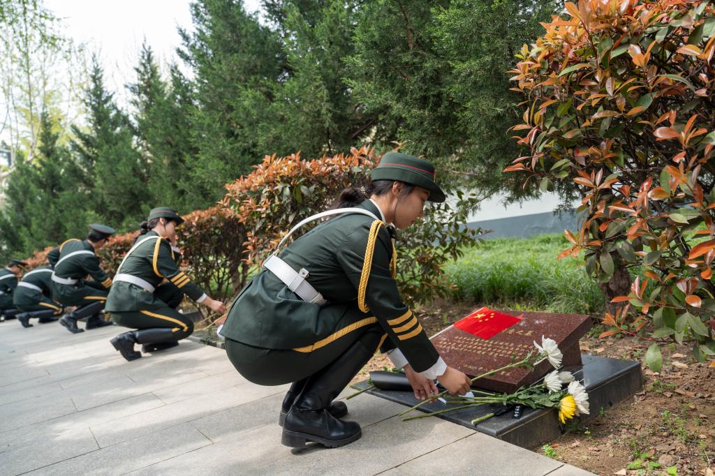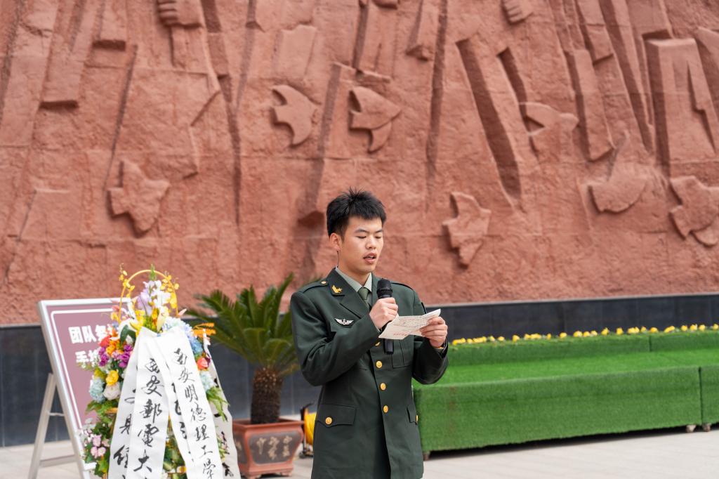 活动现场,退伍学生代表王正升、学生代表郭皓阳、国旗护卫队代表先后发言,结合自身经历讲述对英烈精神的理解,表达新时代青年传承红色基因、勇担时代使命的坚定决心。“革命先烈用鲜血和生命换来了今天的和平生活,作为退伍大学生,我更要做到退伍不退志、退役不褪色,以实际行动践行青年责任。”王正升的发言引发在场师生强烈共鸣。随后,全体人员在领誓人牛威策的带领下集体宣读缅怀先烈誓词,铮铮誓言在陵园上空回响,彰显着青年学子“请党放心、强国有我”的青春担当。