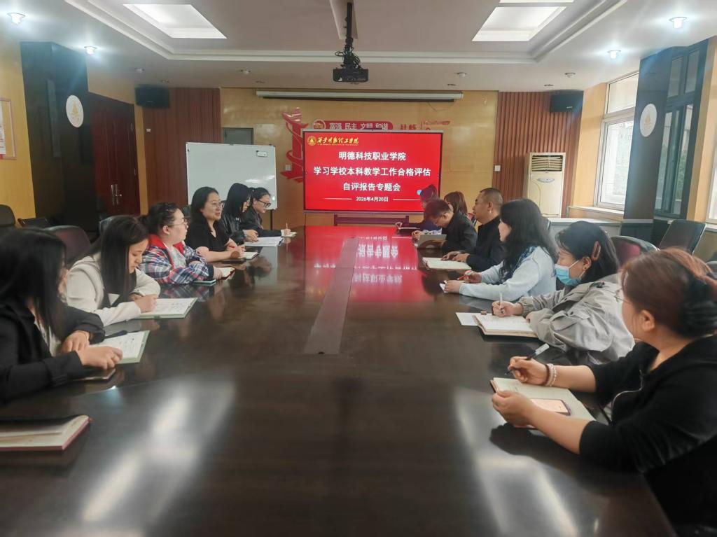 4月20日上午,明德科技职业学院在明理楼216会议室组织全体学工干部召开学校教学工作合格评估自评报告专题学习会。会议由学院党总支副书记王飞主持,聚焦评估核心指标,就学生工作与评建任务深度融合展开研讨。
