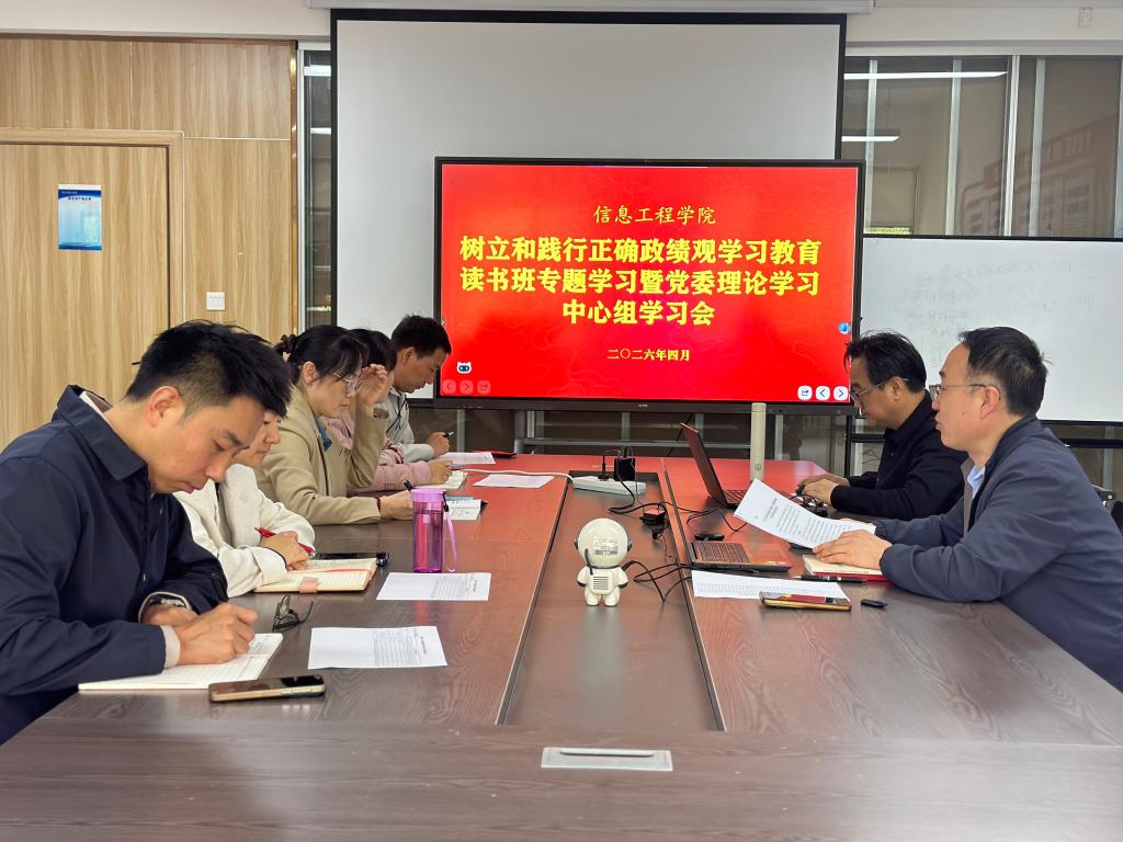 为深入学习贯彻习近平总书记关于树立和践行正确政绩观的重要论述,切实把学习成果转化为推动学院高质量发展的实际成效,4月24日,信息工程学院在学院会议室召开树立和践行正确政绩观学习教育读书班专题学习会暨党委理论学习中心组学习会。学院党政班子成员参加学习,会议由学院党委书记肖千春主持。