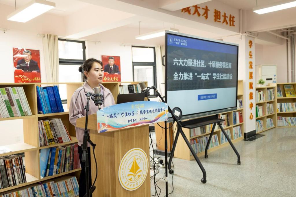 培训中,李秋红系统介绍了“一站式”学生社区建设的发展历程与推进情况,详细介绍了各学生社区的功能配置。在社区使用管理方面,李秋红对申请方式与使用规范作了详细说明。她强调,规范化的使用流程是保障社区高效运转、资源公平共享的基础。围绕“六大力量进社区、十项服务零距离”这一主题,她从六个方面阐述了推进“一站式”学生社区建设的实践路径。一是强化党建领航,建设红色先锋社区,健全党员网格化管理机制,常态化开展主题党课与理想信念教育,实现党团引领零距离。二是推动力量下沉,建设协同育人社区,整合领导、思政、管理、服务、专业及朋辈力量,形成全员、全过程、全方位育人格局。三是突出学生主体,建设自主管理社区,鼓励学生自我管理、自我服务、自我教育,提升学生参与社区事务的主动性。四是厚植文化底蕴,建设人文内涵社区,开展读书会、艺术展演等文化活动,实现文体润心零距离。五是深化数字驱动,建设智慧便捷社区,优化OA系统功能,实现数字服务零距离与高效管理零距离。六是聚焦十项服务,涵盖学业辅导、心理疏导、生活服务、事务办理、资助帮扶、就业指导、党团活动、安全教育、文化浸润、权益维护等方面,确保每一项服务做到窗口前置、响应及时、关怀精准,真正实现服务零距离。