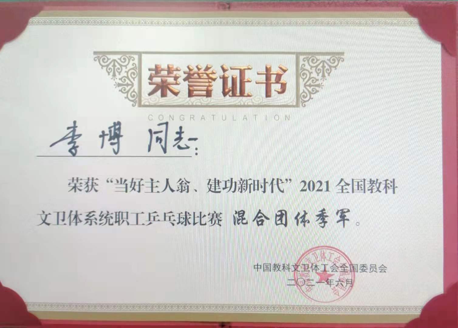 我校李博老师团队意识强、综合素质高、参赛经验丰富被陕西省教科文卫体工会抽调代表陕西省参加比赛。比赛中,李博老师发扬顽强拼搏、敢打敢拼的精神,在团体赛中多次取分,最终荣获混合团体季军、男子青年组单打第五名。