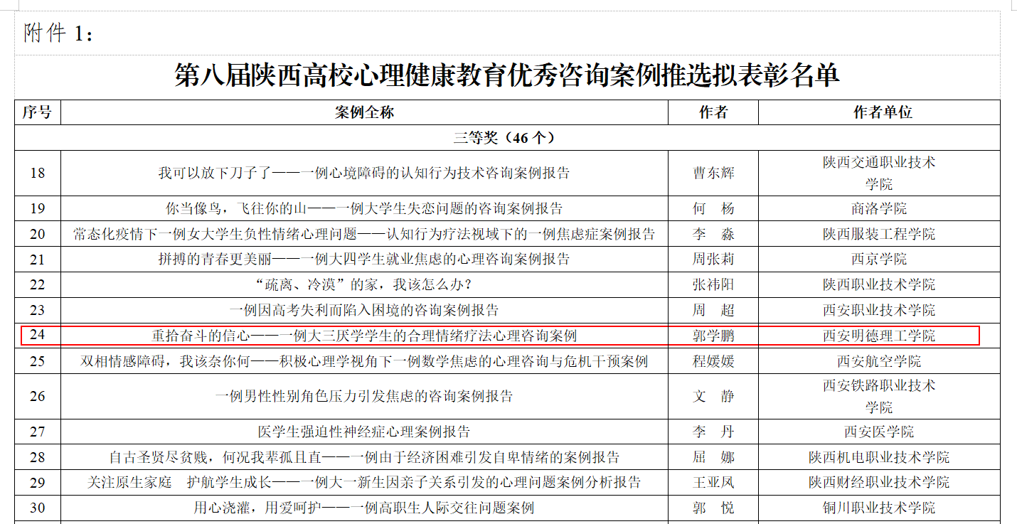 今年3月至6月,陕西省委教育工委开展第七届“阳光护航”心理育人宣传季实践活动,我校积极组织推选优秀作品参加了省级比赛。我校王蕊老师撰写的《直面生活的挑战——大学生挫折心理与压力管理》荣获心理健康教育课程教案省级二等奖;郭学鹏老师撰写的《重拾奋斗的信心——一例大三厌学学生的合理情绪疗法心理咨询案例》荣获心理健康教育优秀咨询案例三等奖。