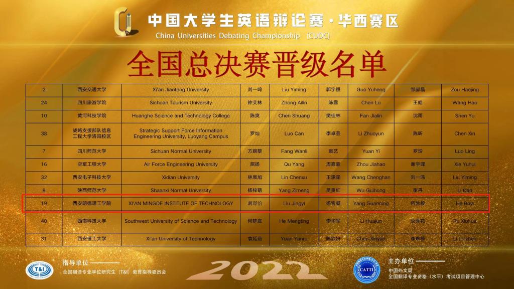 10月15日-16日,2022年中国大学生英语辩论赛(CUDC)华西地区决赛在云端顺利举行。我校2019级英语专业杨官凝和2021级英语专业刘璟怡从校园选拔赛中脱颖而出,代表西安明德理工学院参赛。经过两天五轮鏖战,代表队以总积分排名第20位的成绩成功突围并晋级全国总决赛,创下我校参加英语辩论类赛事的最佳成绩。
