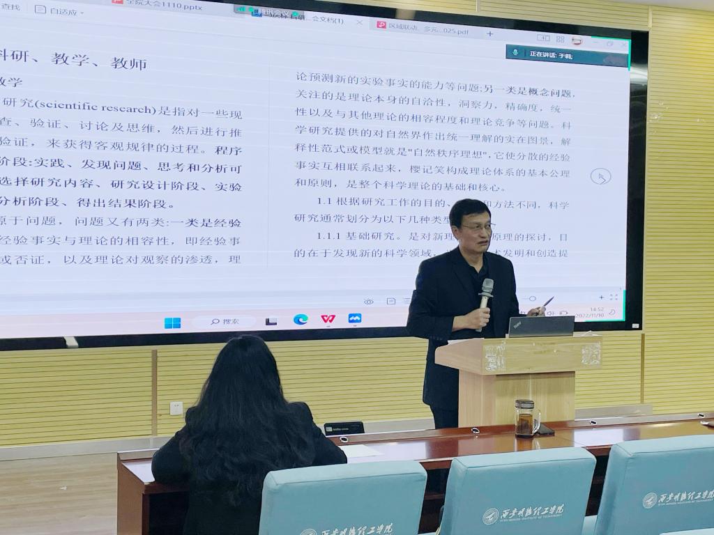 院长马庆林以《科研、教学、教师》为题作了总结报告,从教学与科研的内涵、教学与科研的关系、如何做科研、教师的理解等四个方面进行交流分享。他由教学与科研的定义和基本内涵着手,由浅入深的阐述了两者辩证关系,指出科研是教学的“源头活水”,如果没有科研做支撑,大学课堂教学就会失去“灵魂”。同时还点明做科研一定要有明晰的研究志趣和方向、选择有意义的选题、以解决问题为导向,并阐述了高校教学改革研究课题的八个方向。马庆林强调,教师是学校的第一资本,是学校最丰富、最有潜力、最有生命力的教育资源,教师队伍建设是学校内涵发展的核心,教师的专业成长是学校可持续发展的根本保证,希望全院教师凝心聚力,锐意进取,共同推进我院教学科研工作,提升育人水平和教育教学质量。