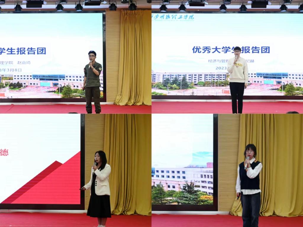 本批优秀大学生报告团通过个人报名、学院推荐,学校组织选拔、培训的方式组建。报告团成员们结合自身成长经历与同学们分享自己大学的学习、生活及工作点滴,奋斗是青年人的底色,作为大学生应树立正确的价值观,珍惜大学时光,努力求知问学,从价值塑造、知识养成、能力提升等各方面打磨自己,用“奋斗”抒写自己的不悔青春。