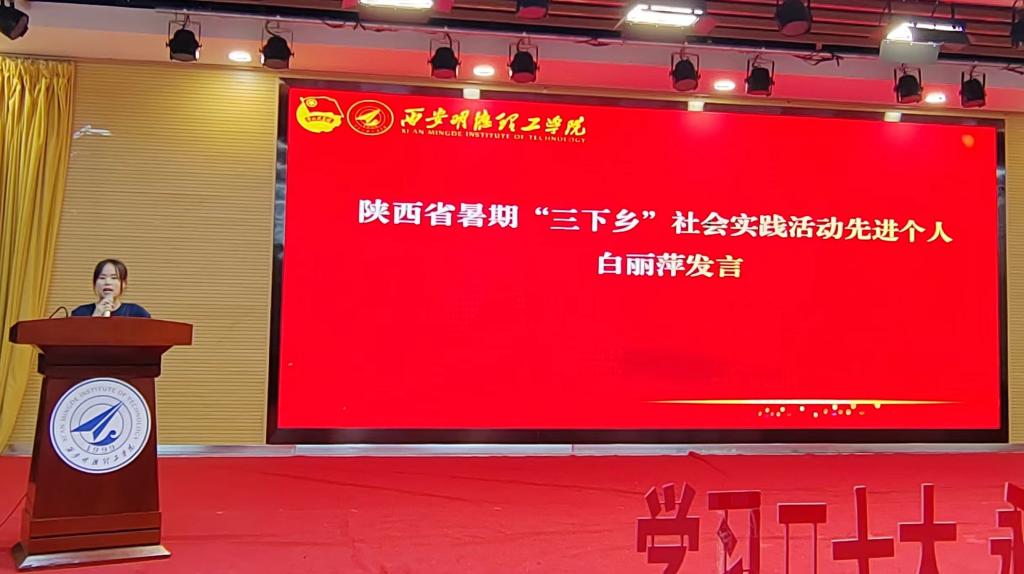 陕西省暑期“三下乡”社会实践活动先进个人白丽萍老师发言。她提出,青年要用青春和自信,用汗水与真诚放飞人生梦想,为民族复兴建功立业,并结合了自身经历动员在场学生积极参加“三下乡”活动。