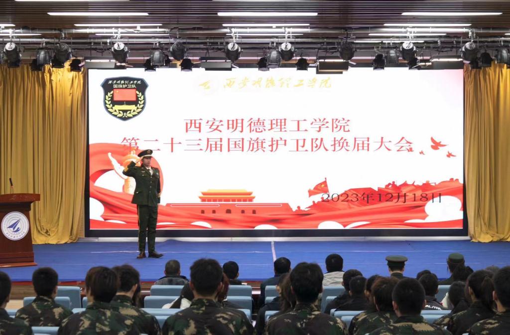12月18日晚,西安明德理工学院国旗护卫队第二十三届换届交接大会在建德楼203报告厅隆重举行。校团委刘雄副书记、乔建副书记、国旗护卫队指导老师李传斌、唐松轩以及西北大学等七所兄弟高校国旗护卫队代表、各学生组织、历届国旗护卫队队员代表参加了换届交接大会。