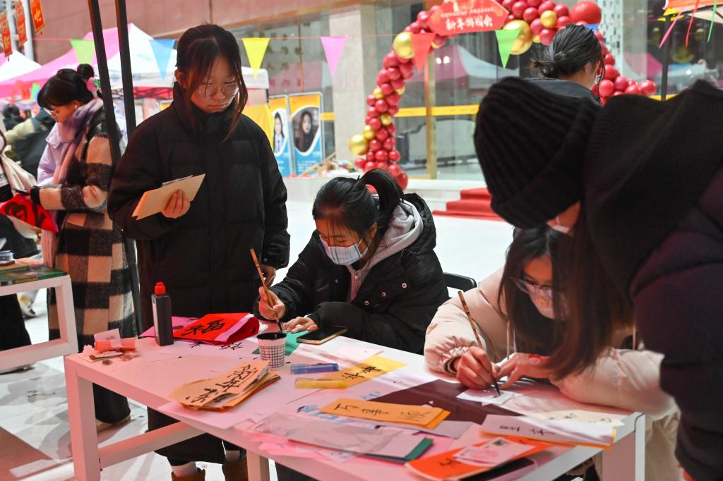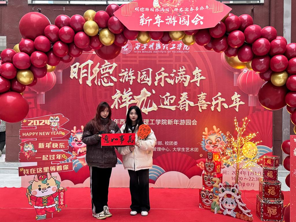 在长安校区,师生们用自己的巧手将往日熟悉的校园一改妆容,“金龙贺岁”红色的游园拱门彰显着元旦喜庆的节日氛围,同学们纷纷上前合影留念;“龙腾虎跃”挑战区各学生组织根据自身特长,精心准备了不同类型的小游戏,如猜灯谜、投壶挑战、中国诗词接龙、气球打靶等,活动现场热闹非凡,同学们也通过游戏加强了沟通;“八面灵龙”极具国风韵味的书法、灯笼、剪纸、新年福签diy手作区,吸引许多同学们参与,动手制作新年手工,陶冶情操的同时表达了自己最真挚的祝福;“龙重登场”新年时光路演精彩的歌舞节目表演也受到了大家热烈欢迎;“齐乐龙龙”同学们在各个展示社团前驻足观赏,在“巡游”互动中感受不同社团的活力;“龙运当头”抽奖区设置主题限量版集“福”卡,同学们通过参加不同摊位活动游戏进行集“福”,集齐相应数量的“福”字可参与抽奖获得新年礼品。游园现场气氛热烈,充满欢声笑语。