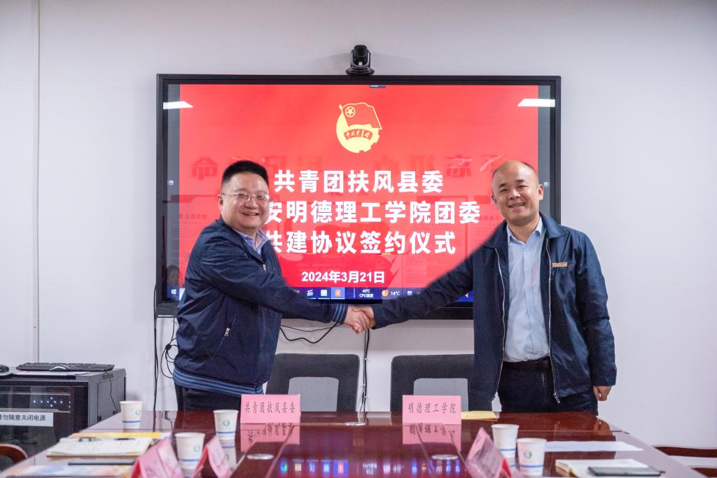 本次签约将探索校地结对共建模式,结合学校各院系特色和社区特点,探索开展校地青年志愿服务矩阵、青年课题共同研究等机制,走出校地“共建、共享、共融”的特色之路,促进人才链、产业链、创新链有机融合。接下来,学校团委将会充分利用校地合作的资源和优势,形成优势互补、资源共享、双向赋能的长期高效合作模式,全力打造、多方位培育青年人才,实现青年发展与基层发展的有机融合、良性互动,让扶风团县委和西安明德理工学院团委不断解锁共青团实践育人工作的高质量发展“密码”。