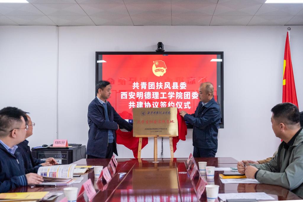 曹雷书记和童杨梓书记共同签约校地团组织共建协议;马霄飞书记和童杨梓书记共同为西安明德理工学院大学生社会实践基地揭牌。
