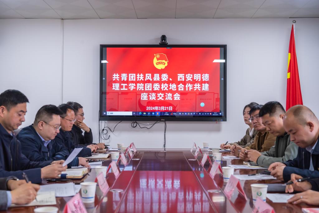 3月21日,共青团扶风县委和学校团委校地共建签约仪式暨大学生社会实践基地挂牌仪式在扶风县工业园区举行,双方就校地合作共建、大学生就业等内容展开交流,并达成共识。扶风县工业园区党工委副书记马霄飞、共青团扶风县委书记曹雷、县人才交流中心主任郭永锋、工业园区经济发展局局长徐靖范,学校团委书记童杨梓、招生就业中心副主任侯磊、团委副书记刘雄,信息工程学院党委副书记高长江、院团委书记王佳龙、辅导员于雯桦、院团委副书记谢培源参加交流会,会议由扶风团县委副书记唐雯莉主持。
