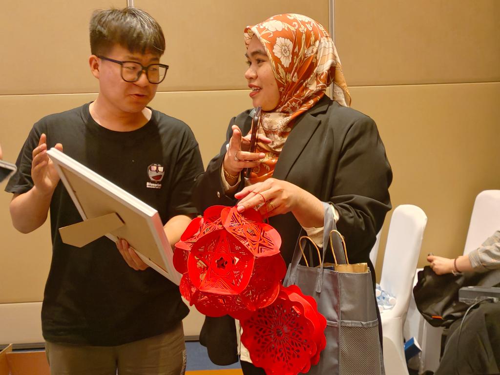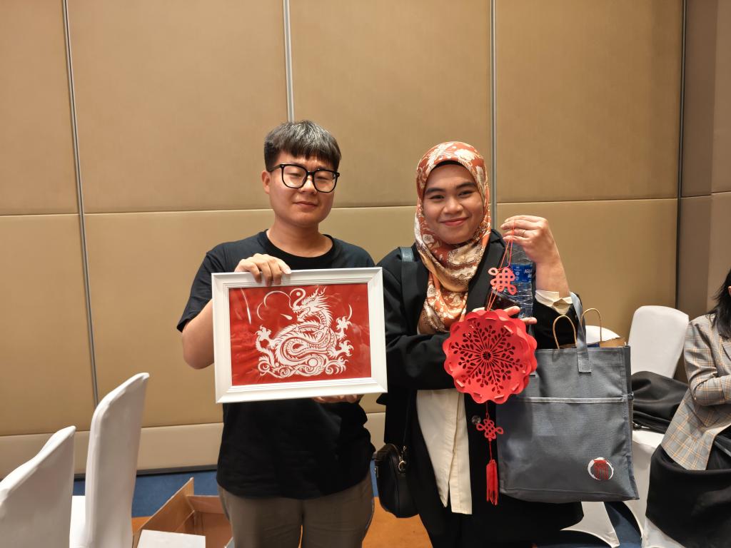 在展示过程中,我校黄土匠心工作室同学向柬埔寨代表详细介绍了剪纸艺术的历史、技艺以及所蕴含的文化内涵并向对方赠予了精心制作的剪纸作品。柬埔寨—东盟国际学院院长Mr. Seang Sopagna对剪纸作品赞不绝口,表示要将这些精美的作品带回他们的学校进行展示,让更多的学生了解到中国的传统艺术。