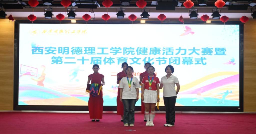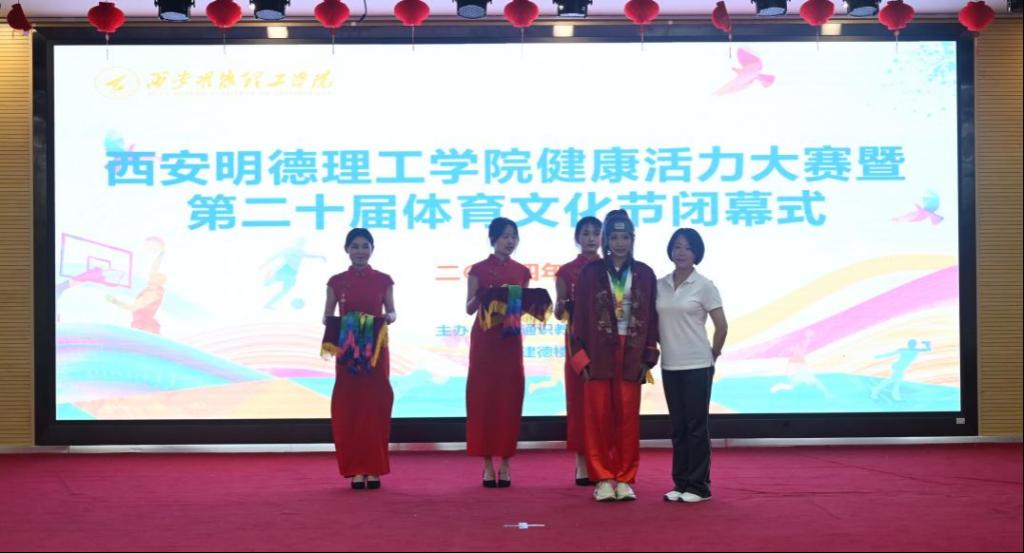 健康活力大赛裁判长田荣老师宣读比赛成绩,并为获奖队伍颁奖。艺术与设计学院获健美操规定动作一等奖;信息工程学院、语言文化与传播学院获二等奖;高等职业技术学院、经济与管理学院、智能制造与控制技术学院获三等奖。另外,艺术与设计学院、高等职业技术学院、经济与管理学院依次获自选动作第一名、第二名、第三名奖项。与此同时,艺术与设计学院、高等职业技术学院、经济与管理学院依次获团体第一名、第二名、第三名奖项。最后,艺术与设计学院宁佐晓老师获“优秀教练员”称号、张思瑶同学获最佳活力奖、经济与管理学院获优秀组织奖、高等职业技术学院六芒星队获最佳编排奖。