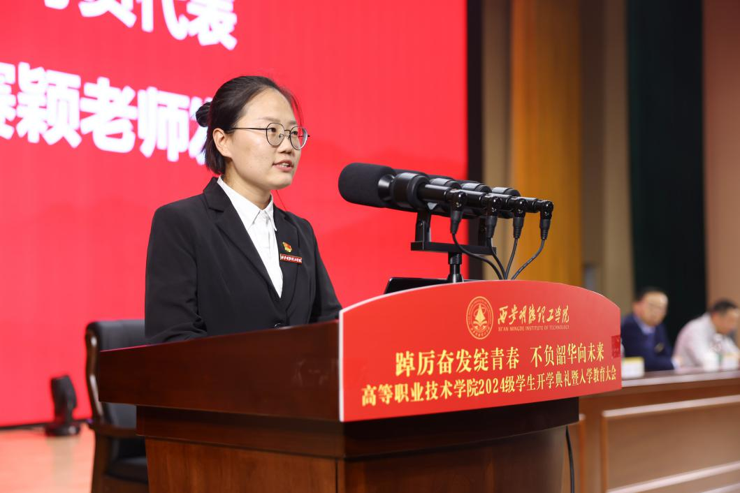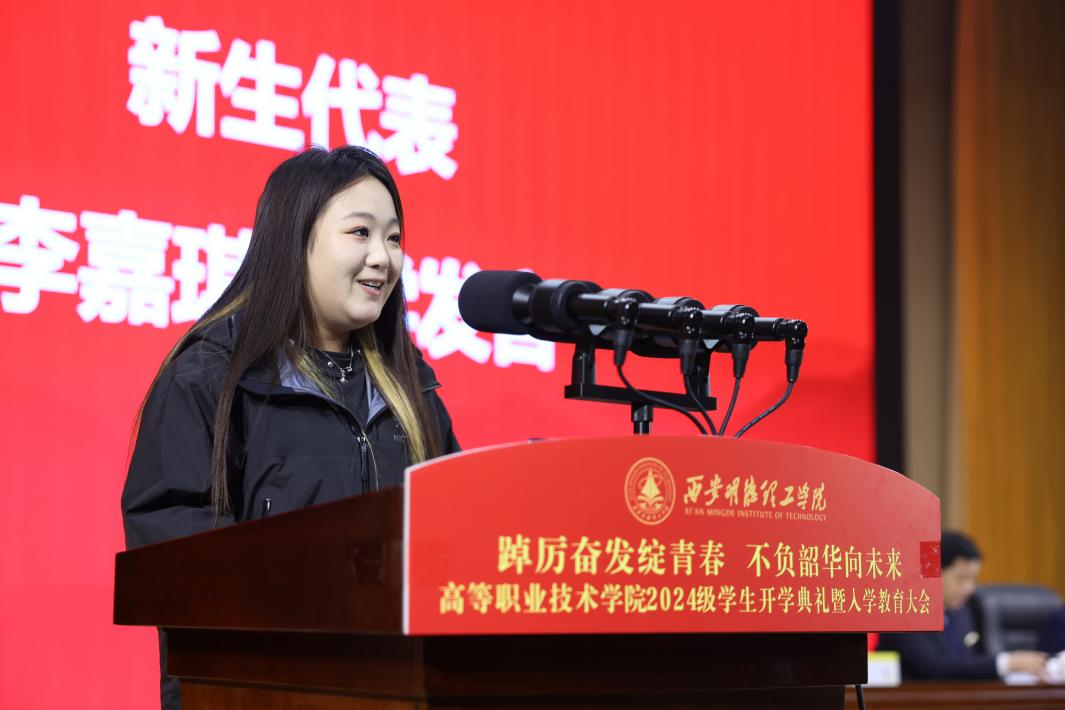 2024级新生代表李嘉琪同学发言。要在大学阶段做好大学生应该做的事,时刻牢记“明德、亲民、至善”的校训,发奋学习,遵守校纪,积极参与校园活动和各类技能竞赛,挖掘自身的无限潜力;并从守信念,志存高远,练本领,精益求精,塑格局,砥砺奋进三个方面鼓励同学们以饱满的热情投入到即将开始的学习和生活中,以实际行动实现理想、报效祖国,为社会作出贡献。
