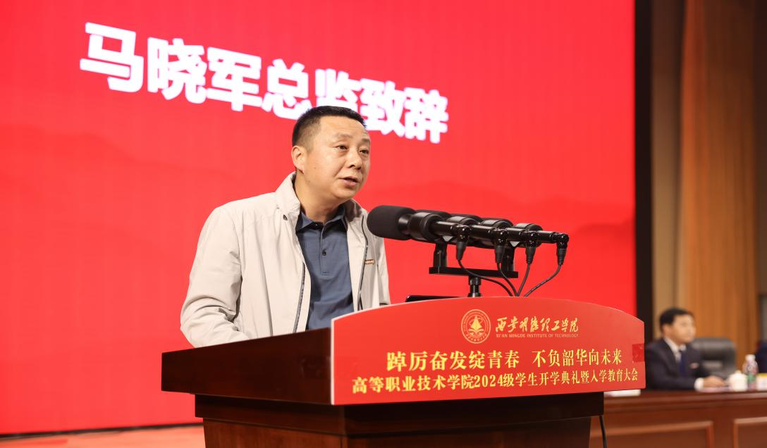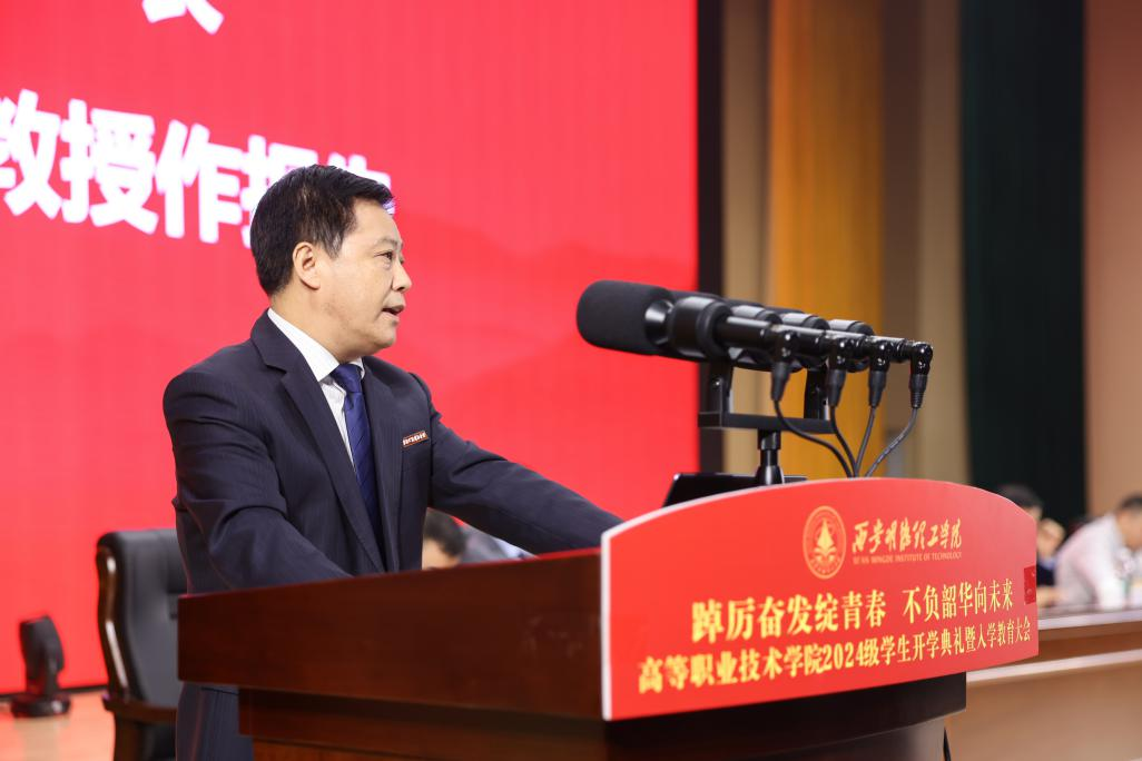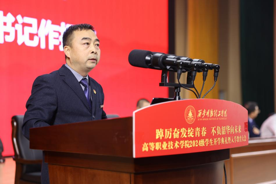 金秋时节,硕果飘香。为引导2024级学生尽快了解大学生活、适应新环境、转变新角色,高等职业技术学院于10月8日在四季廊桥报告厅隆重举行了2024级学生开学典礼暨入学教育大会。学校党委副书记、纪委书记、副校长白秦川,财务总监马晓军,高等职业技术学院领导班子、各专业负责人及教师团队、全体辅导员、教学管理人员以及2024级新生共同参加了会议。会议由学院党总支书记王庭良主持。