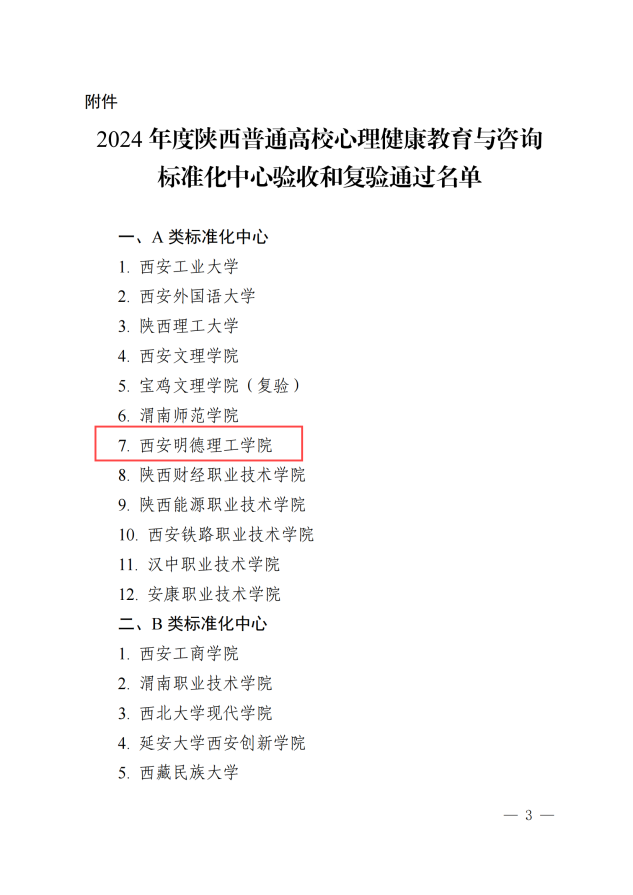 近日,中共陕西省委教育工委公布了《中共陕西省委教育工委关于公布2024年度陕西普通高校心理健康教育与咨询标准化中心验收结果的通知》,学校顺利通过此次验收,大学生心理健康教育中心获评“陕西普通高校心理健康教育与咨询A类标准化中心(原陕西普通高校心理健康教育与咨询示范中心)”。这是学校心理育人工作继2023年顺利通过陕西高校心理健康教育与咨询标准化中心建设验收后,又一次取得的标志性成果。