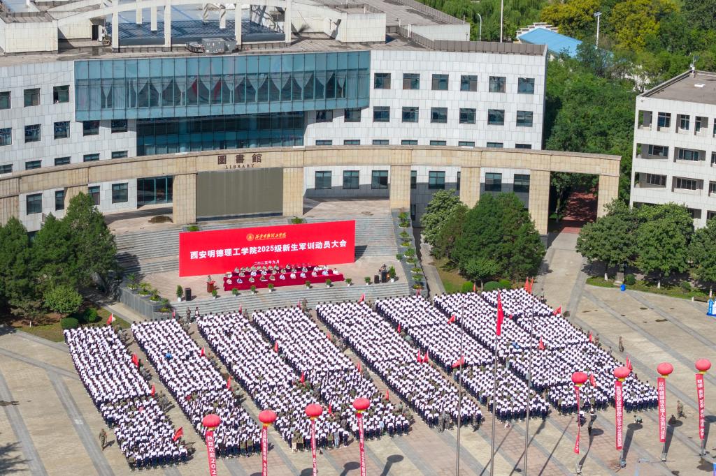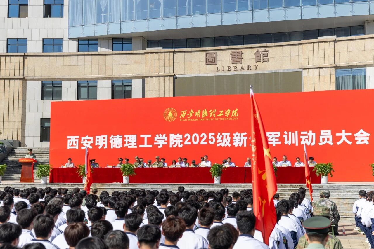 9月8日上午,学校分别在长安校区中心广场、莲湖校区尚德报告厅举行2025级新生军训动员大会。学校校长王志刚、党委书记马川鑫、长安区人民武装部部长张引良、明德源教育集团总裁助理朱延波及全体校领导、相关职能部门、教辅单位负责人、二级学院领导、全体军训旅成员参加本次大会。