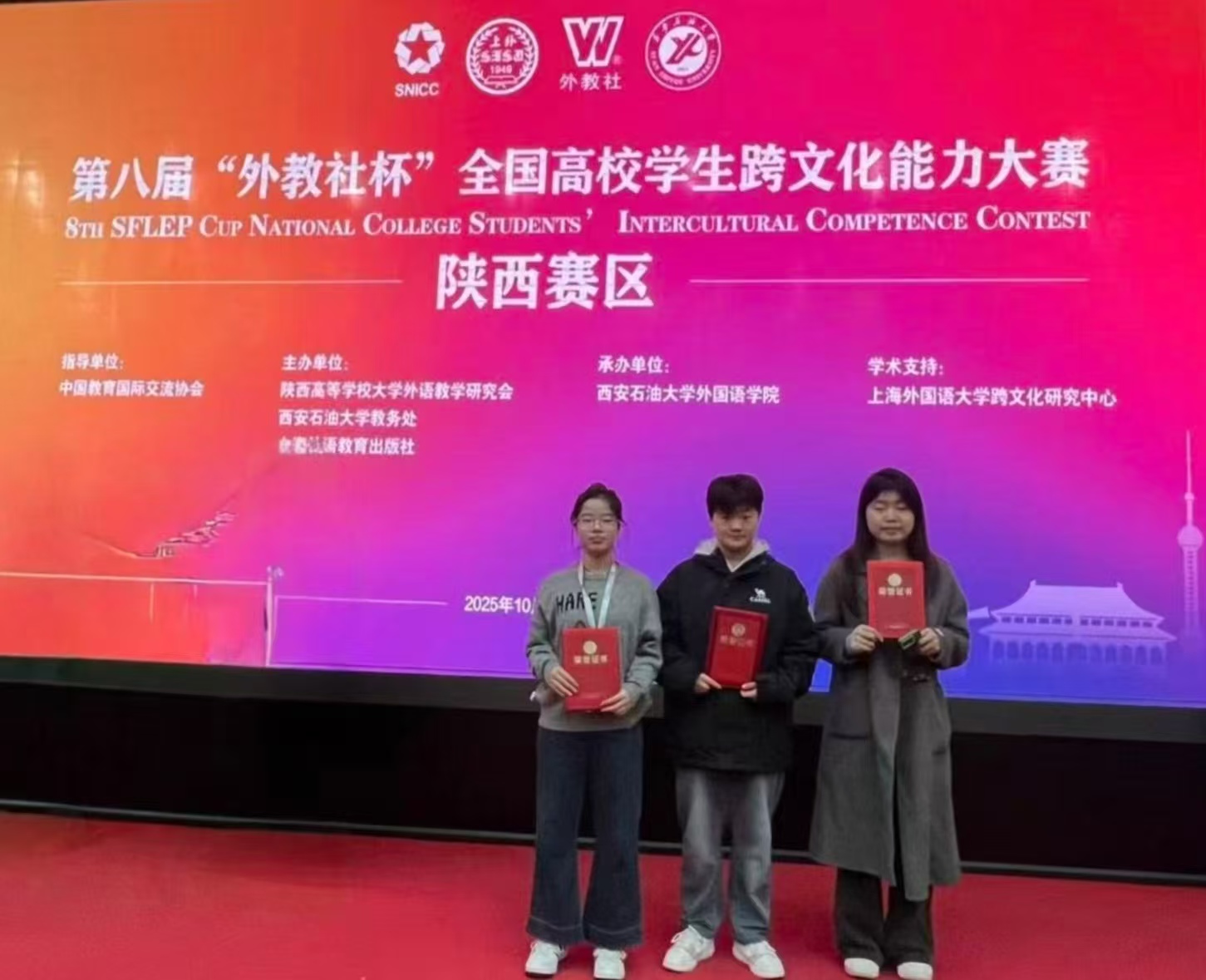 10月18日至19日,由陕西高等学校大学外语教学研究会组织的2025年第八届“外教社杯”全国高校学生跨文化能力大赛陕西赛区复赛与决赛在西安石油大学雁塔校区圆满落幕。我校英语专业张婉琪、会计学专业高思凡和机器人工程专业房博雅三人组成的代表队凭借扎实的跨文化理论功底、出色的现场应变能力与团队协作精神,最终荣获省级三等奖,充分展现了学校在国际化人才培养领域的扎实成果。