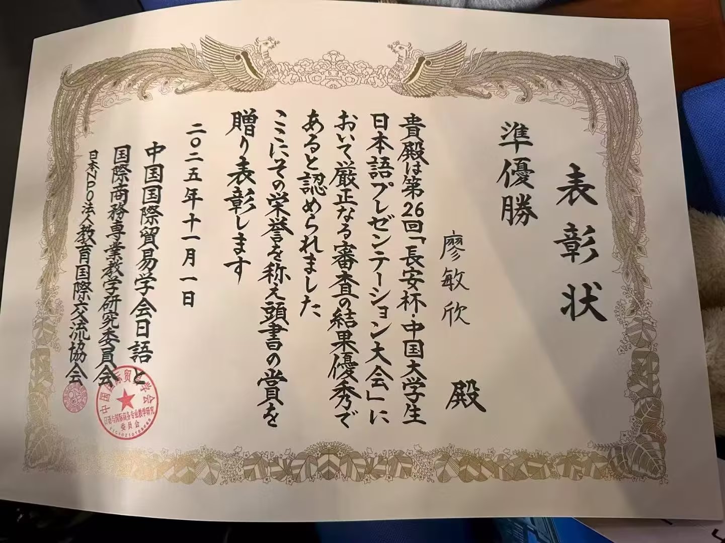 语言文化传播学院日语专业致力于构建“课堂教学+实践竞赛”的多元化培养体系,此次获奖既是学生个人努力的成果,也是专业教学质量的生动体现。今后,学校将持续深化外语教学改革,培养更多兼具国际视野的复合型人才。