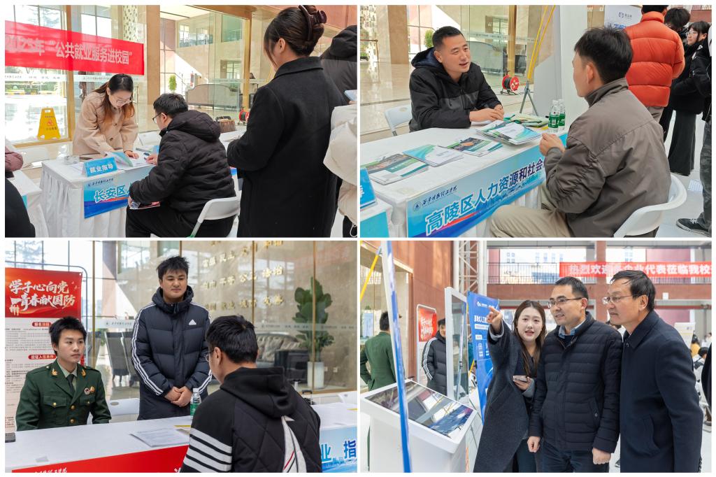 学校党委书记马川鑫、校长助理刘佳在招生就业中心副主任侯磊的陪同下深入招聘会场,主动与人社局工作人员及用人单位沟通交流,征询对学校人才培养的意见建议,为进一步深化校企合作、推进实习基地建设及优化课程体系等提供了有效依据。各学院党委书记(党总支书记)、毕业班辅导员及招生就业中心工作人员深入招聘会现场,结合学院学科专业优势与人才培养成效,与企业代表开展深度交流,细致研判企业岗位需求及行业发展动态,精准推荐优秀毕业生。长安、高陵两区人社局代表分别介绍各自区域人才引进、就业见习、自主创业税收减免等政策。招生就业中心在现场设置了就业指导处并安排专人为毕业生提供就业政策咨询、简历修改、求职面试技巧指导等帮助。学校人武部也安排专人介绍大学生应征入伍流程、优待政策。
