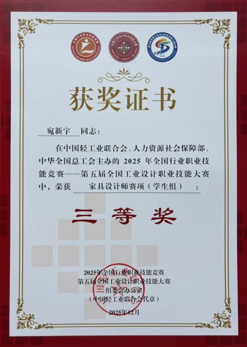 作为我国工业设计领域的顶级赛事,第五届全国工业设计职业技能大赛不仅是技艺比拼的舞台,更是行业人才培养成果的集中检阅。此次宛新宇同学斩获国赛铜奖,不仅是对其个人专业能力的高度认可,更标志着我院设计专业人才培养质量迈上了新台阶,为学校在应用型人才培养领域积累了宝贵经验。