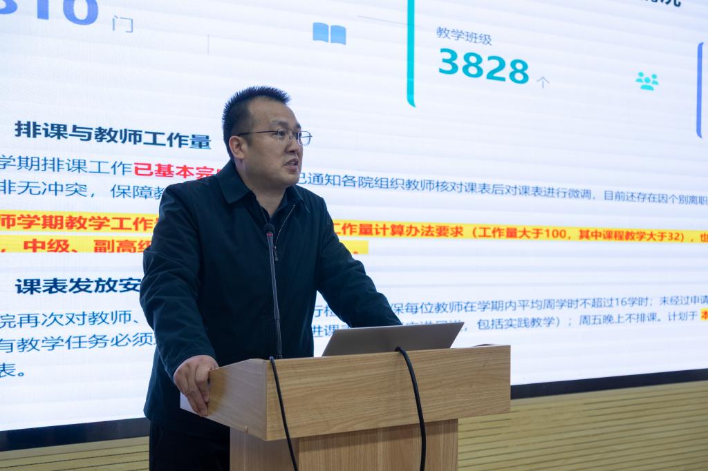 针对教学运行管理,任华处长指出各学院精准核查课表信息,科学优化教学任务安排,严格执行教师工作量核算标准;充分盘活用好各类教学资源,提升教室、实验室等场所使用效益。