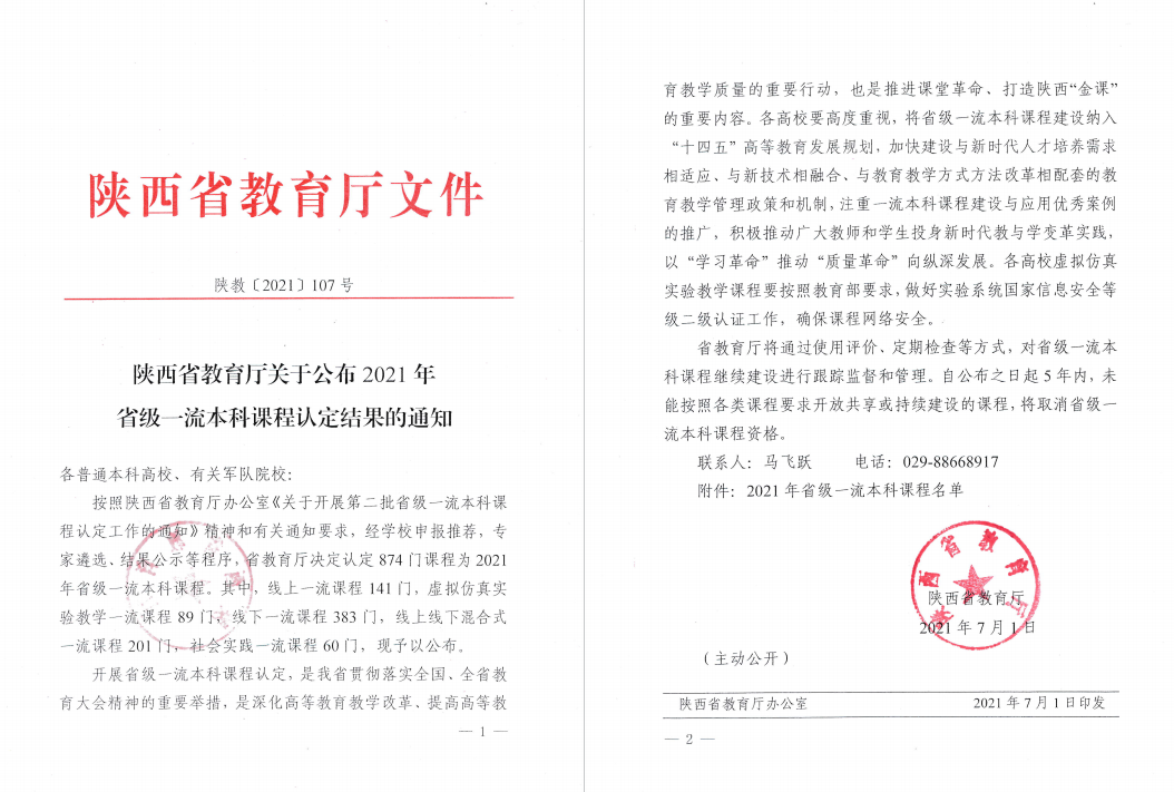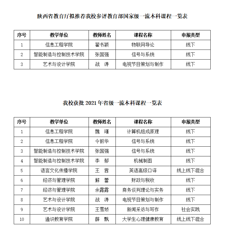 参与申报2021年国家级一流本科课程2门,与今年获批的10门省级一流本科课程共同经过陕西省教育厅认定,拟推荐参评教育部国家级一流本科课程3门,分别是《物联网导论》、《信号与系统》和《电视节目策划与制作》。