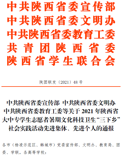 日前,中共陕西省委宣传部、中共陕西省委文明办、中共陕西省委教育工委、共青团陕西省委、陕西省学生联合会共同下发了《关于2021年陕西省大中专学生志愿者暑期文化科技卫生“三下乡”社会实践活动先进集体、先进个人的通报》文件。我校荣获2021年陕西省大中专学生志愿者暑期文化科技卫生“三下乡”社会实践活动“省级优秀组织单位”荣誉称号,学校“千声助盲童·万心祝西藏”盲童之光社会实践服务队荣获“省级标兵团队”称号,云横秦岭考察队、“水之心”关爱母亲河社会实践服务队荣获“省级优秀团队”称号,教师鄢盼盼、韩祜生、胡梦妮荣获“省级先进个人”称号。