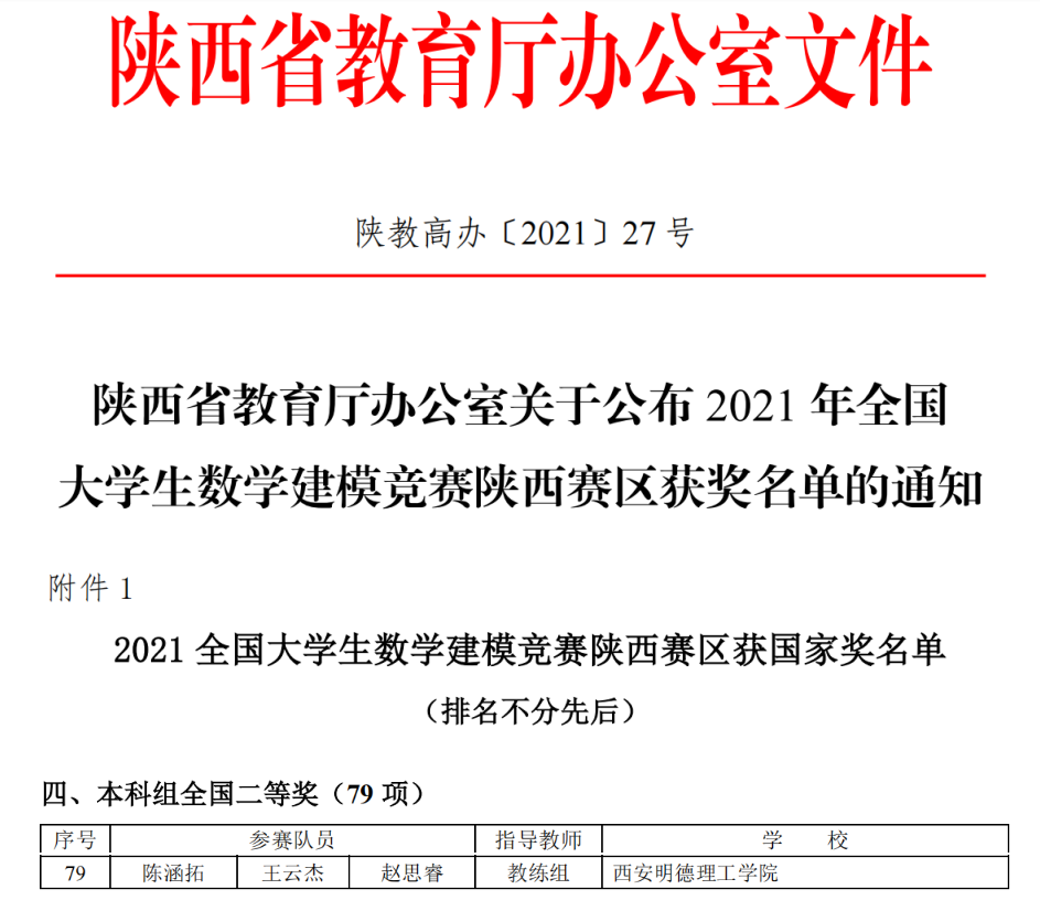 近日,2021年高教社杯全国大学生数学建模竞赛(CUMCM)成绩揭晓。学校共有42支本科组队伍、8支专科组队伍参赛,最终斩获本科组全国二等奖1项,陕西省一等奖13项,陕西省二等奖20项;专科组陕西省一等奖4项,陕西省二等奖4项。同时,我校蝉联陕西赛区优秀组织奖。