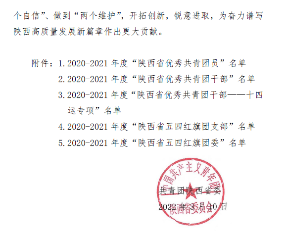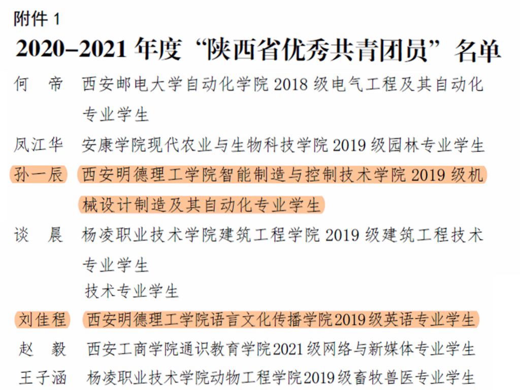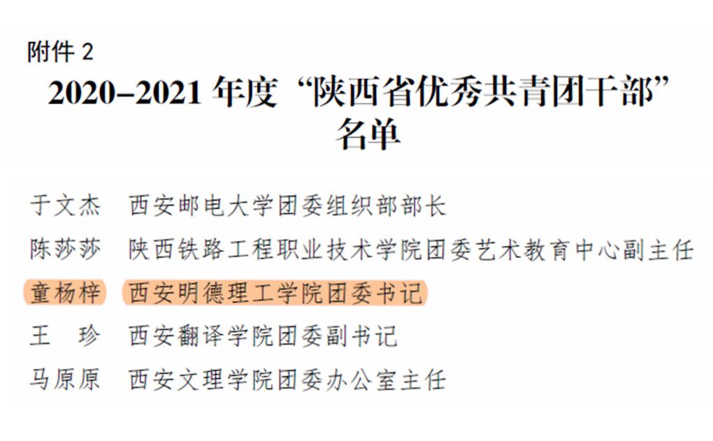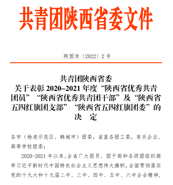 日前,共青团陕西省委下发《关于表彰2020-2021年度“陕西省优秀共青团员”“陕西省优秀共青团干部”及“陕西省五四红旗团支部”“陕西省五四红旗团委”的决定》。学校团委书记童杨梓被授予“2020-2021年度陕西省优秀共青团干部”荣誉称号,语言文化传播学院2019级英语专业学生刘佳程、智能制造与控制技术学院2019级机械设计制造及其自动化专业学生孙一辰被授予“2020-2021年度陕西省优秀共青团员”荣誉称号。