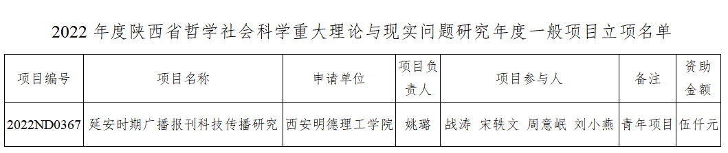 近日,陕西省社会科学界联合会公布了2022年度陕西省哲学社会科学重大理论与现实问题研究项目立项结果,我校艺术与设计学院姚璐老师的课题《延安时期广播报刊科技传播研究》获得立项,这是我校在该领域科研项目零的突破。