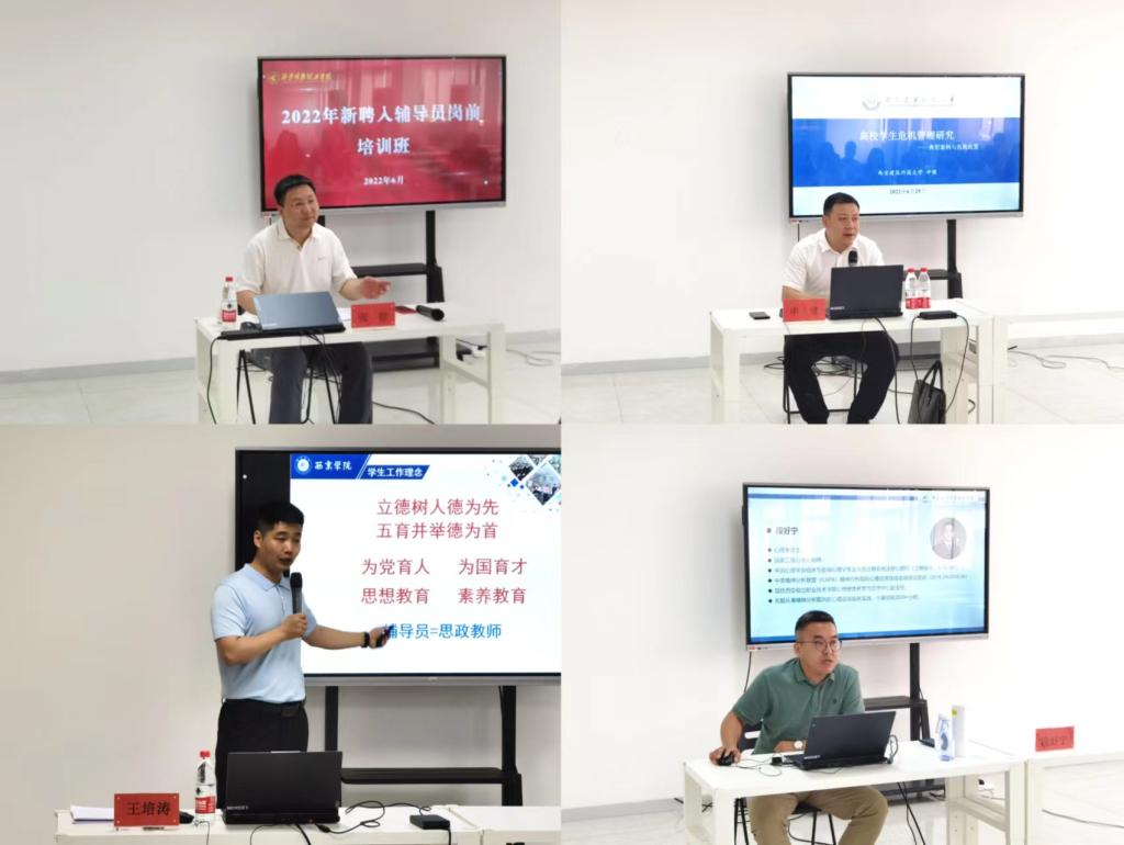 西安建筑科技大学学生处长申健紧密结合高效学生工作实际,为大家讲解了突发事件应急处置及网络舆情应急处理的方式方法。注册心理咨询师段好宁结合大学生心理咨询的特点,详细介绍了大学生心理危机的识别方法与处理技巧以及如何在日常工作中释放个人压力;西京学院博雅书院院长王培涛就高校学生工作精准管理,从高校学生工作理念、学生核心素养教育、学生安全稳定管理、四维心理工作平台等方面,给予了大家宝贵的建议和意见。西安翻译学院党委副书记、副校长张恒与培训班学员以及辅导员代表就学生管理工作中的具体案例进行了研讨。高等职业技术学院院长舒忠以《练好“七项基本功”做合格高校辅导员》为题,结合自己工作经历给大家分享如何提升辅导员职业综合素质;经济与管理学院党委书记何文举围绕辅导员如何做好繁杂的日常工作同时,更好地开展学生工作进行了详细介绍和阐述;人力资源处康抗就学校人事制度各方面给新入职辅导员们做了讲解。培训班上,还安排了信息与工程学院王兴鹏、智能制造与控制技术学院梁瑞娜以及经济与管理学院胡梦妮三名辅导员结合自身工作经验和职业成长经历给大家做了分享。