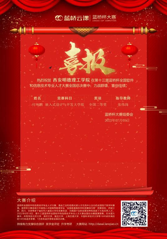 近日,第十三届“蓝桥杯”全国软件和信息技术专业人才大赛(电子类)国赛结果揭晓,我校信息工程学院参赛学生付坤鹏同学荣获全国二等奖,其在张伟岗老师的带领下所完成的竞赛项目为“嵌入式设计与开发大学组”。