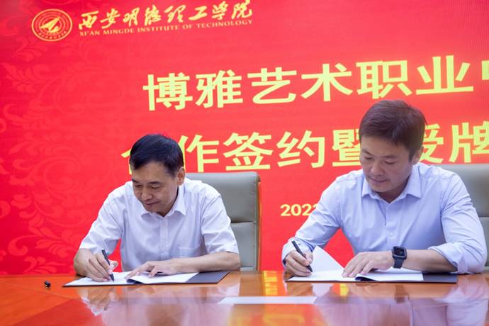 2022年7月15日上午,西安明德理工学院与博雅艺术职业中学举行“优质生源基地”签约授牌仪式。西安明德理工学院校长杨健君、副校长刘星,艺术与设计学院院长苟秉宸、副院长冯强,招生就业中心主任刘佳,以及艺术与设计学院、招生就业中心相关人员参会。博雅教育集团理事长白帆,博雅艺术职业中学校长张胜强、副校长兰乐,西安水墨画室校长刘鹏,西安博雅国际教育学院校长胡龙、副校长张松等出席此次签约授牌仪式。仪式由刘星副校长主持。