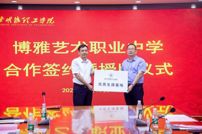仪式最后,校长杨健君代表我校与博雅艺术职业中学签署“合作协议书”,为同时为博雅艺术职业中学授予了“优质生源基地”、“明德博雅艺术类教育教学基地”、“就业实习基地”牌匾。