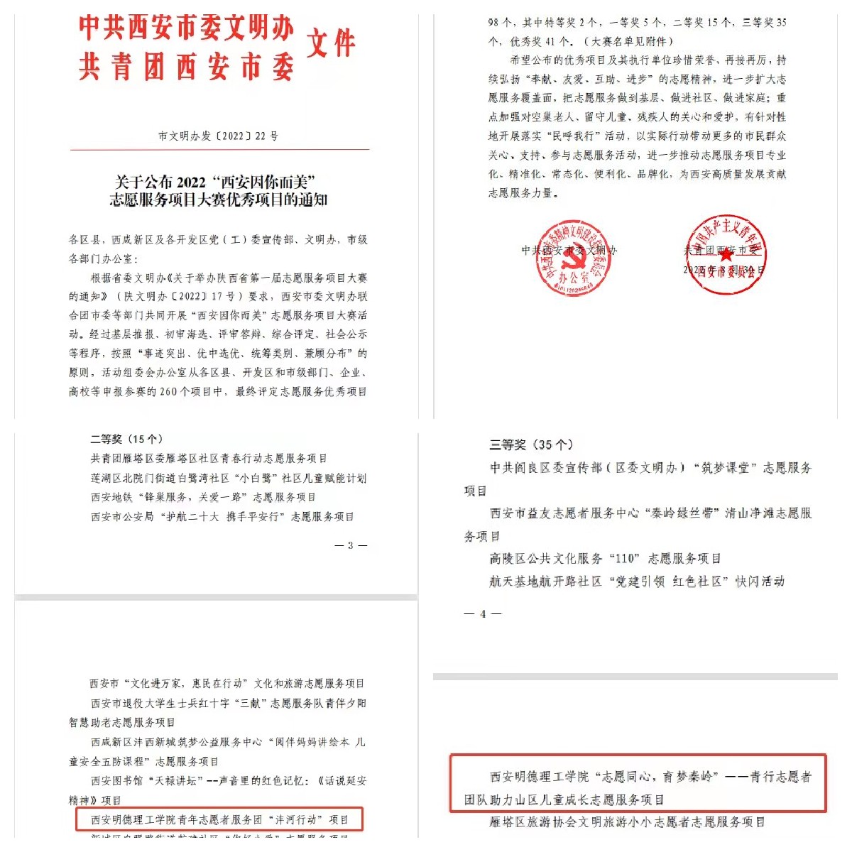 近日,由西安市委文明办、团市委主办,各区县委(开发区)文明办承办,西安市新时代文明实践指导中心、西安市青年志愿者行动指导中心协办的“西安因你而美”之志愿服务项目大赛经过基层推报、初审海选、评审答辩、综合评定等程序,遴选出98个优秀项目(特等奖2个,一等奖5个,二等奖15个,三等奖35个,优秀奖41个)。其中,我校青年志愿者服务团“沣河行动”项目获得二等奖,“‘志愿同心,育梦秦岭’——青行志愿者团队助力山区儿童成长项目”获得三等奖。