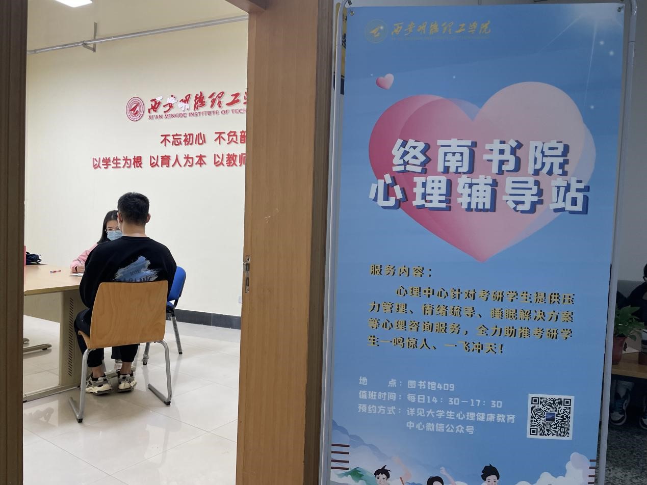 三是,开展日常咨询服务,设置终南书院心理辅导站。心理中心加强宣传,通过公众号“明德心灵家园”发布心理咨询/心理疏导通知,畅通心理咨询途径。设置心理中心终南书院心理辅导站,针对考研学生提供压力管理、情绪疏导、睡眠解决方案等咨询服务,为考研学生顺利备考保驾护航。