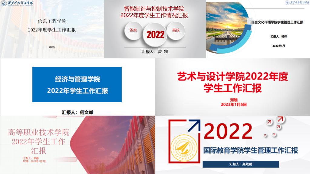 会上,各学院副书记(学生管理科科长)分别从学生思想政治教育、价值引领、日常管理、职业规划与就业帮扶、安全教育、突发事件应对、心理健康教育、社会实践等方面对全年工作进行了全面总结和分析研讨,同时也对2023年的学生工作计划进行了梳理与展望。